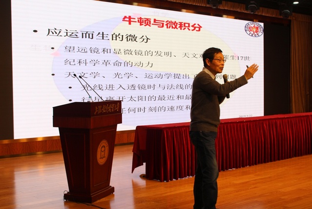 開幕式結束后,陸立強教授作了了題為《數學天生愛建模——牛頓時代的微積分》的講座。他通過對流數法、幾何體積計算的闡述,簡述萬有引力的發現等內容,結合多個實例向大家展示了建模之美,并鼓勵同學們多多學習并使用數學建模的方法,參與到各項數學活動中來,感受其帶來的樂趣。