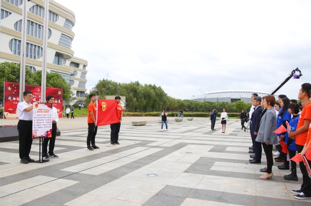 五星紅旗下,團員代表張子熠發表了題為《敢有青云志,莫欺少年窮》的演講,用鏗鏘有力的聲音表達了當代青年志達青云、榮校報國的決心,也抒發了對祖國母親無盡的熱愛之情。緊接著,由7位優秀暑期社會實踐項目代表同學,也以朗誦的形式匯報自己的所思所感,向祖國70周歲生日獻禮。