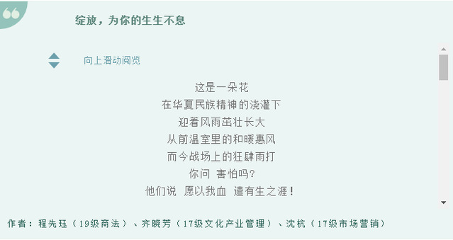 在這場疫情防控阻擊戰中,上經貿大的青年學子們用“說”“誦”“寫”“奏”“繪”“學”“做”等方式展現出新時代中國青年的風采,譜寫一篇篇靚麗的青春華章。這堂特別的“云間思政課”吸引了全校師生共同參與,激勵了我校90后、00后青年學生更好地學習領會習近平總書記的回信精神,從中汲取成長養分,認清肩上的使命和責任,樹立遠大志向,不懼風雨,勇挑重擔,讓青春綻放絢麗之花。