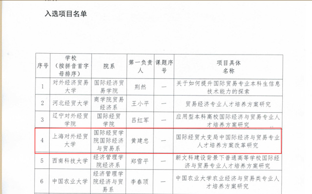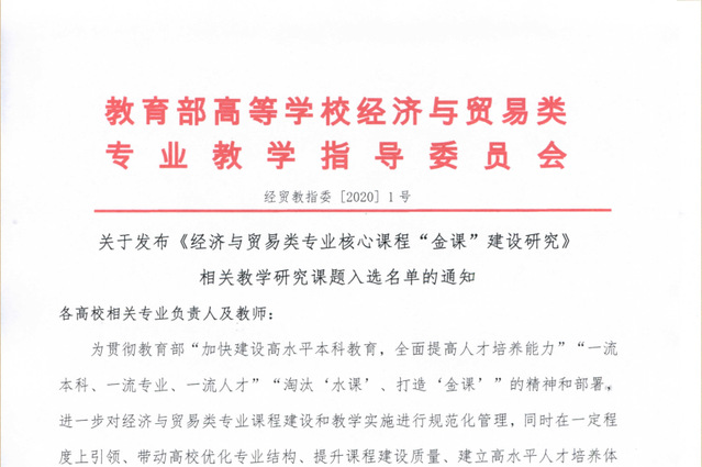 近日,經教育部高等學校經濟與貿易類專業教學指導委員會組織專家評審,我校國際經濟與貿易專業申報的“國際經貿大變局中國際經濟與貿易專業人才培養方案改革研究”、“建設貿易強國背景下《中國對外貿易》金課建設研究” 和“建設貿易強國背景下《國際貿易實務》金課建設研究” 3個項目入選“經濟與貿易類專業核心課程金課建設研究”資助。此次發布的研究課題是教育部經濟與貿易類專業教學指導委員會首批“金課”建設項目,來自全國28所本科院校的32個項目入選。