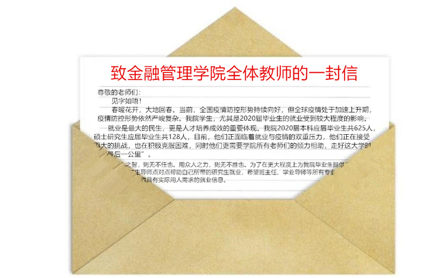 金融管理學院黨委書記和院長全面落實畢業生就業工作“一把手”工程。學院黨政聯席會議將就業作為重要議題,書記和院長明確將就業工作作為各項工作的重中之重,明確系主任、教師支部書記齊抓,全體教師共同參與的工作原則,明確研究生導師嚴格落實研究生就業的第一指導人責任,副書記每周專題匯報就業情況。學院發布《致金融管理學院全體教師的一封信》。學工隊伍通過“云就業·云指導·云服務”系列模式,一方面確保就業信息充分供給,并根據行業、地域等關鍵要素分類,將就業信息精準供給不同學生群體,另一方面堅持需求導向,實施“一人一策”就業指導和“一人一冊”就業服務臺賬。畢業班輔導員每周形成《就業工作周報》,及時比對數據,緊抓就業進度。