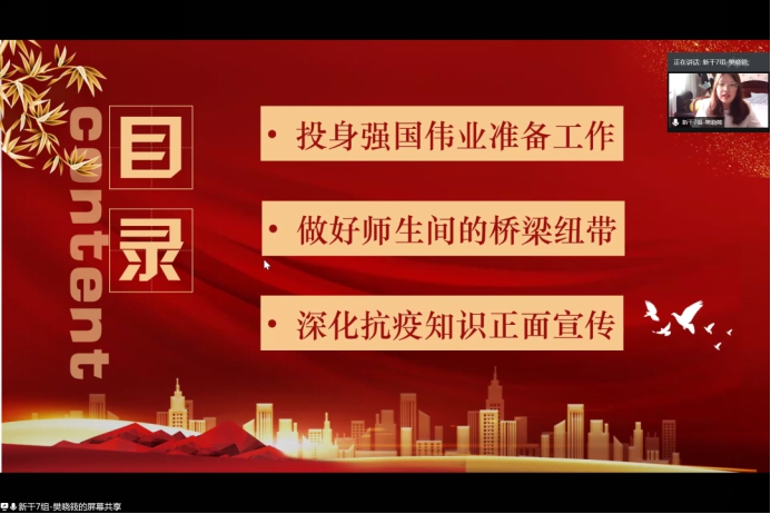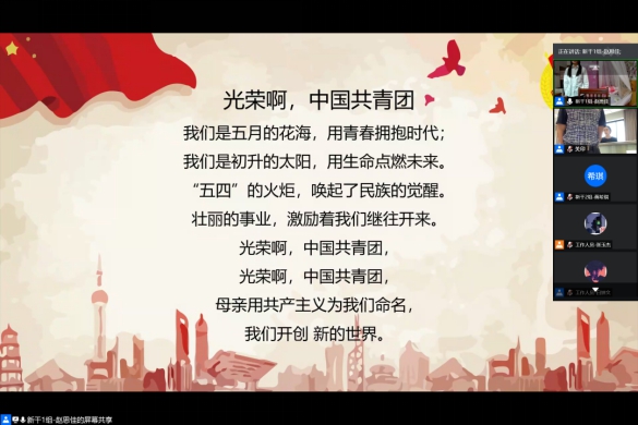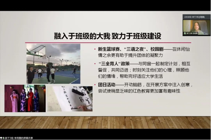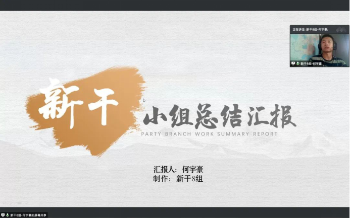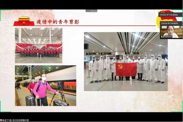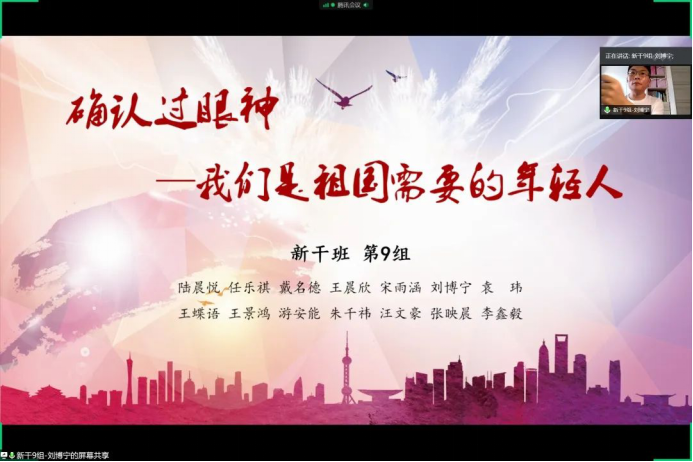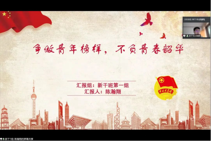隨后,新干班各組進(jìn)行主題為“爭做青年榜樣,不負(fù)青春韶華”的小組展示。小組代表們從學(xué)習(xí)習(xí)近平總書記五四寄語入手,結(jié)合疫情下的青年擔(dān)當(dāng)、學(xué)生干部培訓(xùn)班的學(xué)習(xí)體悟,帶來了精彩的展示,彰顯了新時代青年干部們不負(fù)青春韶華、勇于擔(dān)當(dāng)時代使命的決心。