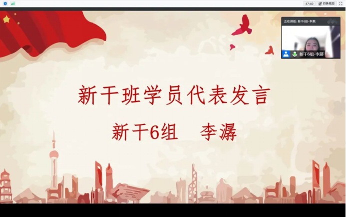 新干6組學(xué)員、金融1901團(tuán)支部團(tuán)支書李潺作為新干班的學(xué)員代表,分享了她對于一名合格學(xué)生團(tuán)干部的認(rèn)識。首先,要有堅定的理想信念。學(xué)生團(tuán)干部不僅要完成好基礎(chǔ)的日常工作,還要有更高層次的追求。其次,要站穩(wěn)立場,做好聯(lián)系老師與同學(xué)們的橋梁。特別是在疫情期間,更要在自我革新中自我提高,做出無愧于老師、同學(xué)和自己的貢獻(xiàn)。最后,要繼承和發(fā)揚(yáng)五四精神,堅定理想信念,練就過硬本領(lǐng),為上經(jīng)貿(mào)大代言,為時代發(fā)聲。