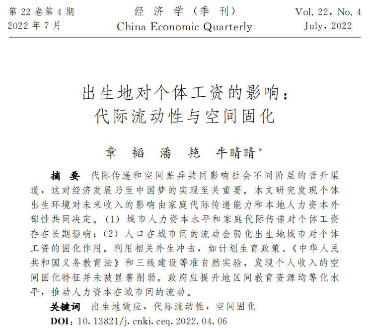 近日,國際經(jīng)貿(mào)學(xué)院章韜副教授與合作者的論文《出生地對個人工資的影響:代際流動性與空間固化》,在國內(nèi)經(jīng)濟領(lǐng)域的權(quán)威期刊《經(jīng)濟學(xué)(季刊)》發(fā)表(2022年第4期),其合作者潘艷是我校國際經(jīng)貿(mào)學(xué)院碩士研究生,牛晴晴是我校畢業(yè)的碩士研究生,現(xiàn)在上海財經(jīng)大學(xué)商學(xué)院攻讀博士。《經(jīng)濟學(xué)(季刊)》(China Economic Quarterly)創(chuàng)刊于2001年,主要發(fā)表原創(chuàng)性的理論、經(jīng)驗、綜述和評論性的中文經(jīng)濟學(xué)論文,是國內(nèi)公認(rèn)的經(jīng)濟學(xué)權(quán)威期刊,該期刊被我校列為A1類期刊。