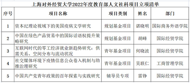 近日,教育部社會科學司公示了2022年度教育部人文社會科學研究項目評審結果,我校獲批5項,其中規劃基金項目2項、青年基金項目2項、輔導員專項1項。