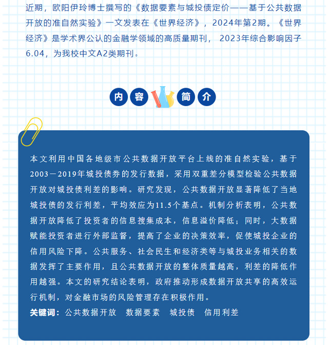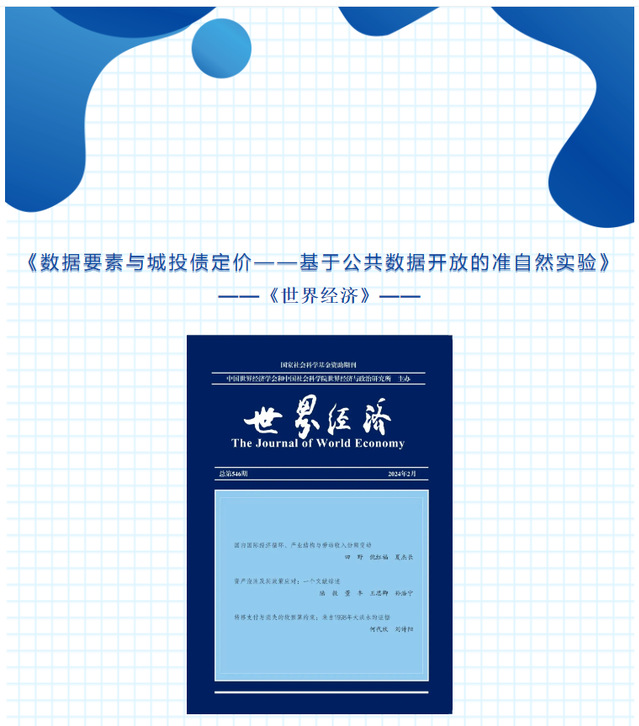 學術前沿|我校歐陽伊玲博士論文《數據要素與城投債定價——基于公共數據開放的準自然實驗》在《世界經濟》發表