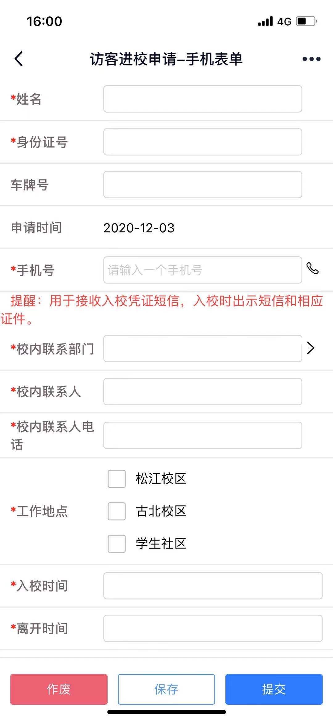 凡外來(lái)人員進(jìn)校報(bào)備,須至少提前1天由外來(lái)訪客或部門(mén)聯(lián)系老師掃描“訪客進(jìn)校申請(qǐng)二維碼”,按照要求如實(shí)登記進(jìn)校人員的“姓名、身份證號(hào)、車(chē)牌號(hào)、手機(jī)號(hào)、校內(nèi)聯(lián)系部門(mén)、校內(nèi)聯(lián)系人、校內(nèi)聯(lián)系人電話、辦公地點(diǎn)、入校時(shí)間、離開(kāi)時(shí)間、入校事由等事項(xiàng)”并按提示上傳“本人隨身碼截圖”,完成后點(diǎn)擊提交即可。