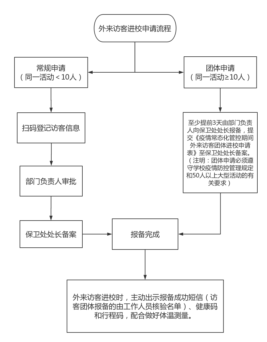 如外來訪客團體申請進校(同一活動≥10人申請進校),須嚴格遵守學校疫情防控管理規定和50人以上大型活動管理要求,至少提前3天由部門負責人向保衛處報備,并提交附件二:《疫情常態化管控期間外來訪客團體進校申請表》。