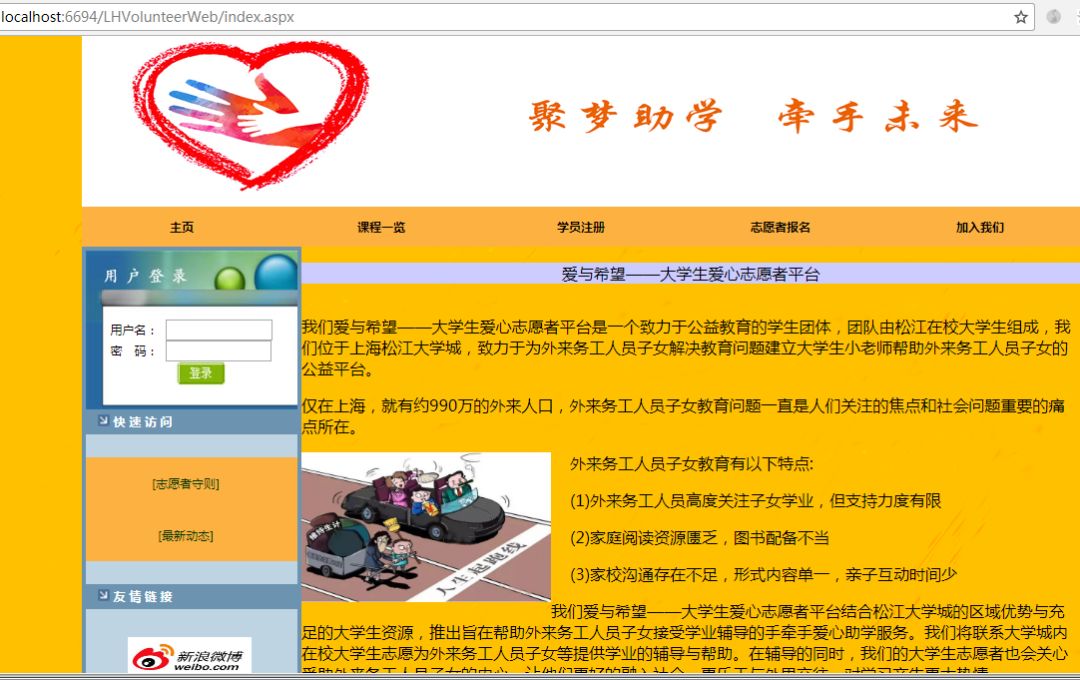 “愛與希望——大學生愛心志愿者平臺”針對近年來外來務工人員子女的教育這一熱點問題進行展開,外來務工人員的家長望子成龍、望女成鳳,但是迫于自己受到的教育較少、文化較低、收入水平也有限,無法支持子女接受到良好的教育;其次,由于外來務工人員平常大多外出打工,沒有足夠的時間去教育、陪伴以及監管子女,造成了他們的子女不能及時受到教育,在價值觀、思想觀上容易走偏,因而,為外來務工人員子女提供教育機會事關社會民生和穩定。本作品從信息技術解決問題視角出發,基于Visual studio 2010的C#和SQL Server2008技術開發了面向志愿者教師和面向待接受教育家庭的網上平臺,為緩解外來務工人員子女教育缺失的現狀出一份綿薄之力。