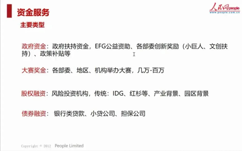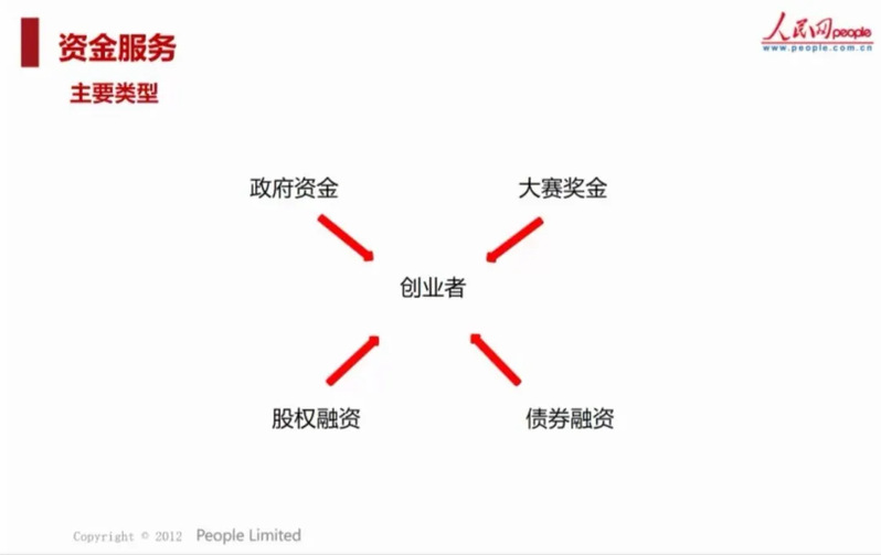 資金服務的主要類型包括政府資金、大賽獎金、股權融資和債券融資。