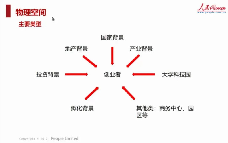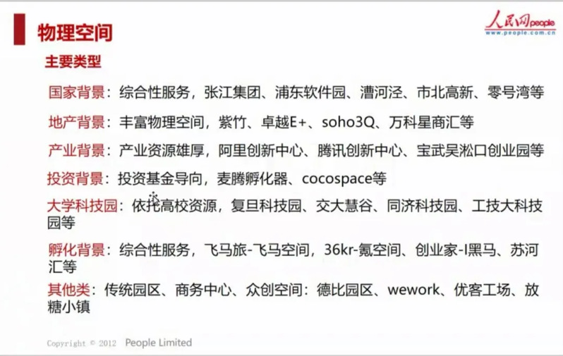 物理空間的主要類型有:國家背景為創業者提供綜合性服務,如張江集團、浦東軟件園等;地產背景為創業者提供了豐富的物理空間,如紫竹、卓越E+等;產業背景有雄厚的資源,如阿里創新中心、騰訊創新中心等;投資背景有很多自己的專屬孵化機構,如麥騰孵化器、cocospace等;還有教育背景為很多依托高校資源的大學科技園,如復旦科技園、交大慧谷等。通過這些物理空間創業者可以獲得較為完善的服務體系。
