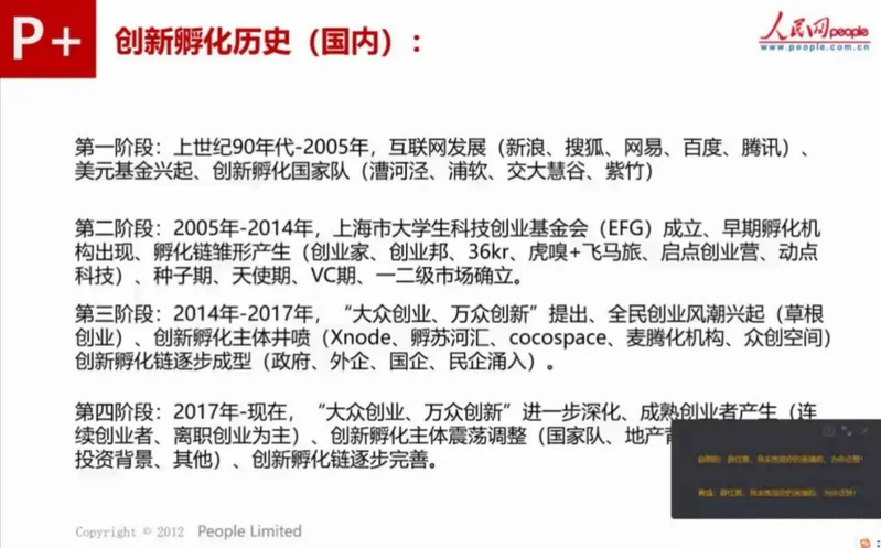首先老師介紹了國內創新孵化的歷史,我國的創新孵化歷史從上世紀90年代開始至今經過了四個階段:第一階段在上世紀90年代至2005年,隨著互聯網的發展以及美元基金的興起,出現了創業孵化國家隊,如漕河涇、浦軟等。第二階段處于2005年至2014年,,此時早起孵化機構出現,孵化鏈雛形產生。第三階段處于2014年至2017年,全民創業風潮興起,創新孵化鏈逐步成型。第四階段為2017年到現在,此階段產生了成熟的創業者,創新孵化鏈逐步完善。