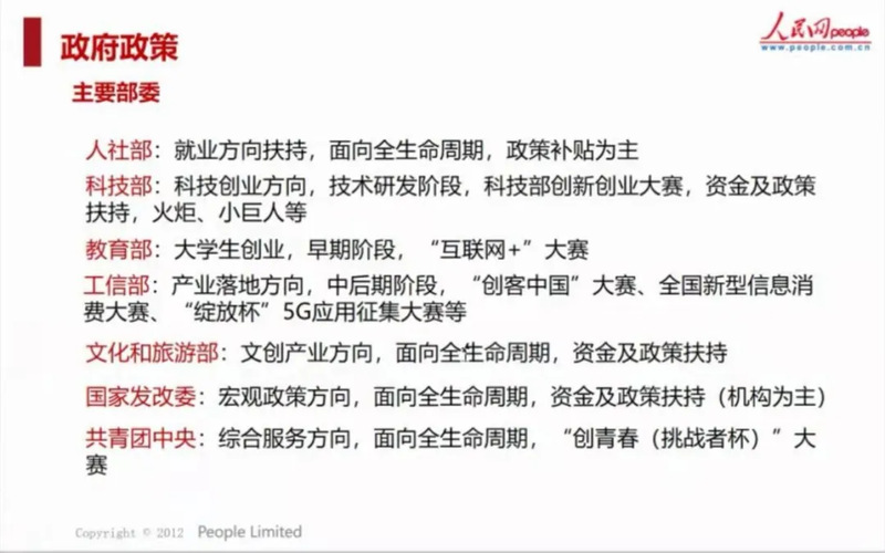 在創業過程中,一些政府部委與我們息息相關,如人社部、科技部、教育部、工信部、文化和旅游部、發改委、共青團中央等各級部委會給我們提供很多創業上的政策支持,如各項創新創業類比賽,創業資金支持、創業場地房租補貼等。