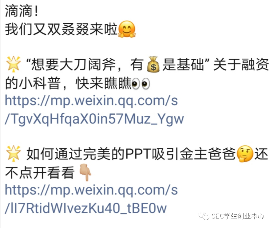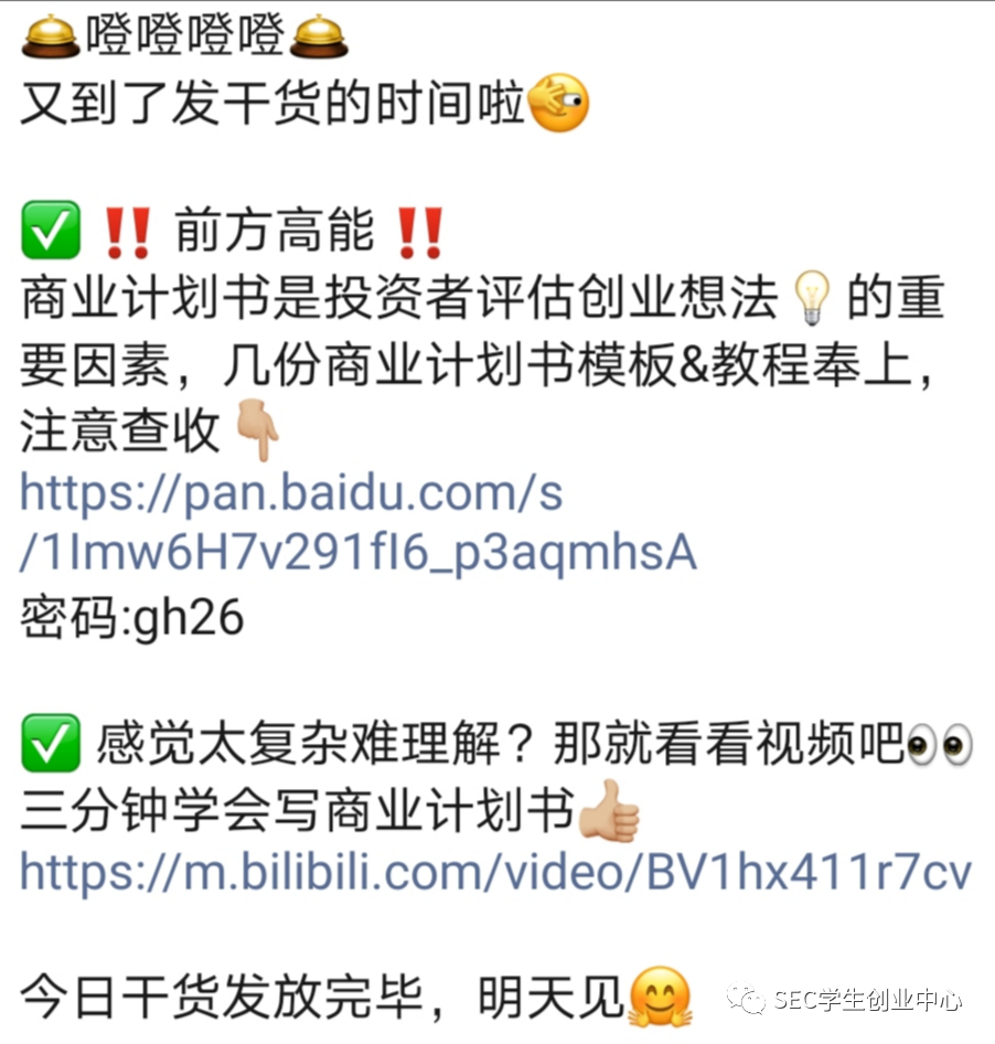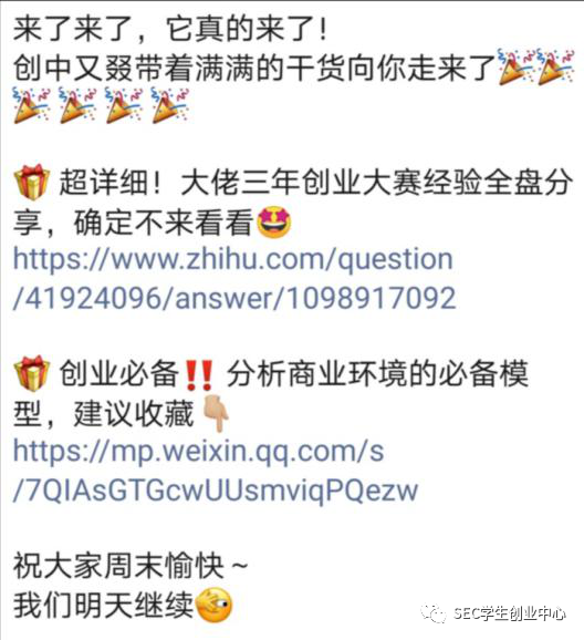 而預(yù)熱群內(nèi)每天也是高潮迭起,總有一份驚喜禮包在晚上等著你!從創(chuàng)業(yè)政策解讀到思維導(dǎo)圖PPT合集,從創(chuàng)賽經(jīng)驗(yàn)分享到融資科普,從創(chuàng)業(yè)必備公眾號安利到相關(guān)書籍電影推薦……我們的群助手每天都會在群里分享與創(chuàng)業(yè)相關(guān)的n個(gè)小知識,確保同學(xué)們能在本次的活動(dòng)中滿載而歸。
