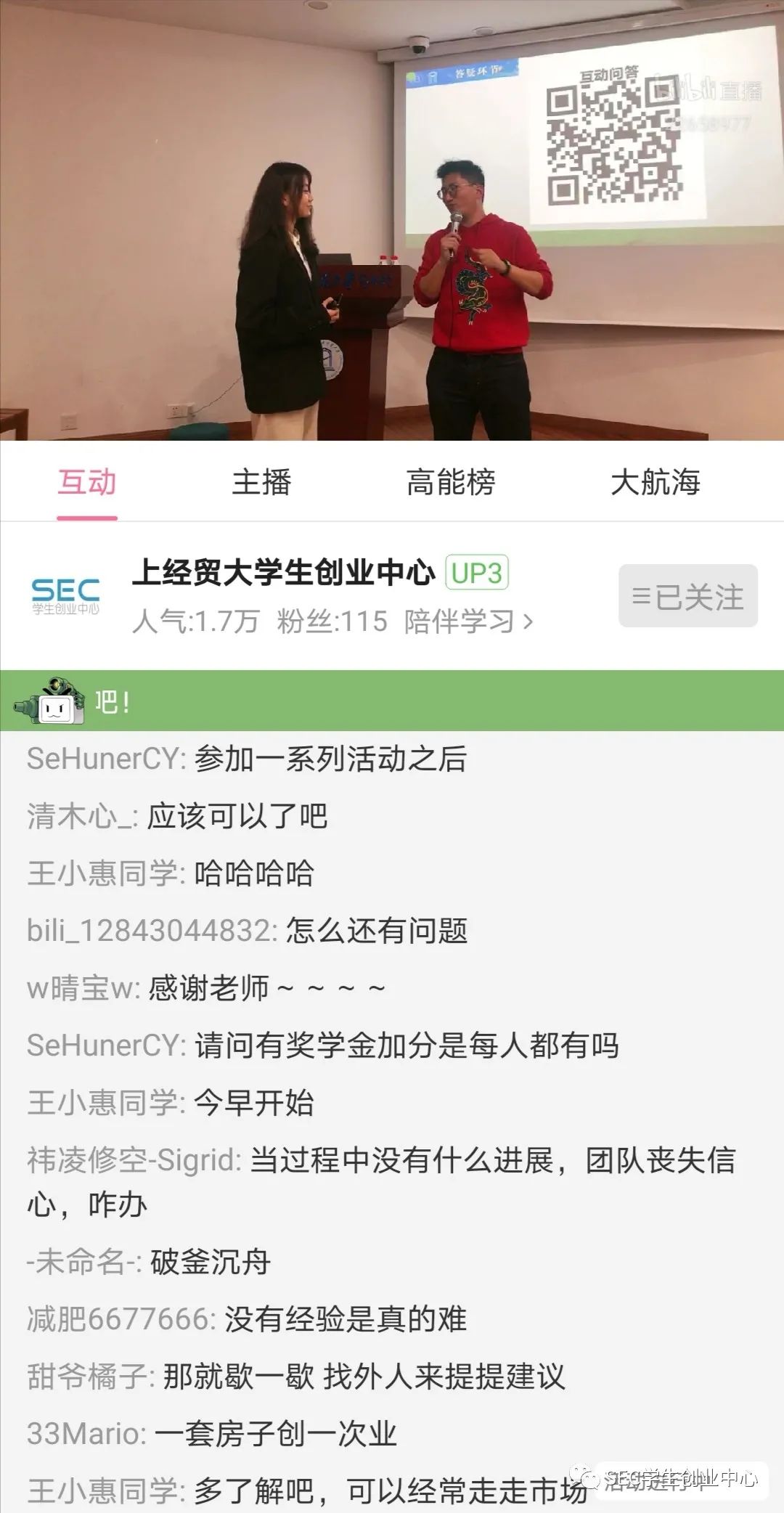 12月9日晚20:00,學(xué)生創(chuàng)業(yè)中心成功于B站開展了首次線上直播。