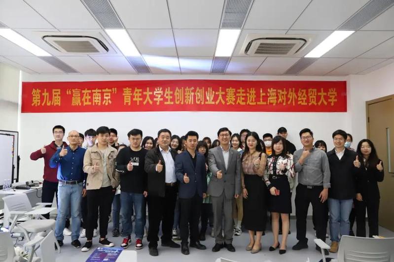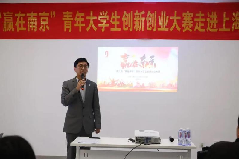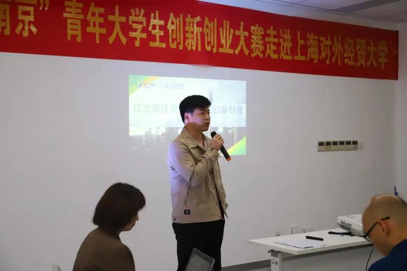 4月23日上午10點,第九屆“贏在南京”青年大學(xué)生創(chuàng)新創(chuàng)業(yè)大賽上海對外經(jīng)貿(mào)大學(xué)宣講會在行知樓116舉行。本次宣講會由南京市人力資源與社會保障局主辦,上海對外經(jīng)貿(mào)大學(xué)創(chuàng)業(yè)學(xué)院承辦,上海對外經(jīng)貿(mào)大學(xué)學(xué)生創(chuàng)業(yè)中心協(xié)辦。南京市勞動就業(yè)服務(wù)管理中心主任常鋒,上海對外經(jīng)貿(mào)大學(xué)創(chuàng)業(yè)學(xué)院副院長高偉,南京市勞動就業(yè)服務(wù)管理中心一級科員焦季波,南京市建鄴區(qū)人力資源和社會保障局科長何駿、人力資源和社會保障局科長曹旌,南京市江北新區(qū)教育和社會保障局三級主任科員王珺,南京市鼓樓區(qū)勞動就業(yè)管理中心創(chuàng)業(yè)負(fù)責(zé)人劉潔,上海庭赫信息科技有限公司總經(jīng)理張庭赫出席本次宣講會。