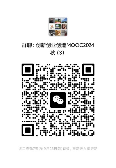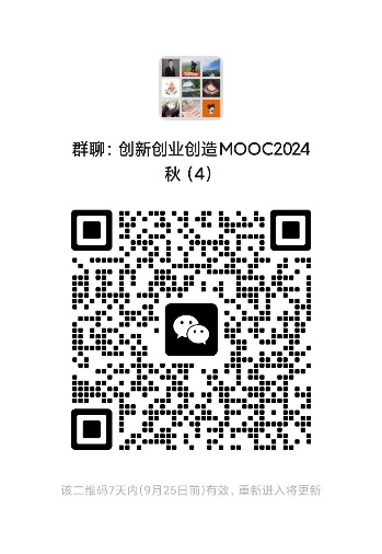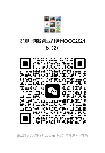 已在校內選課的同學,登錄平臺后會自動跳出該課程,請確認并修讀“共享課”,同時請掃碼加入課程微信群,方便隨時溝通。(創新創業創造MOOC2024秋(2),創新創業創造MOOC2024秋(3),創新創業創造MOOC2024秋(4)加入其中一個群即可,勿重復加群。)如群二維碼過期,請到行知樓121門口直接掃碼進群。