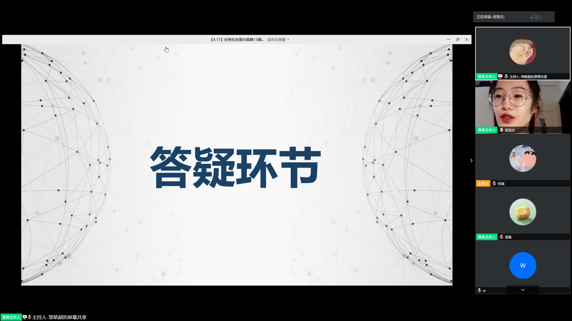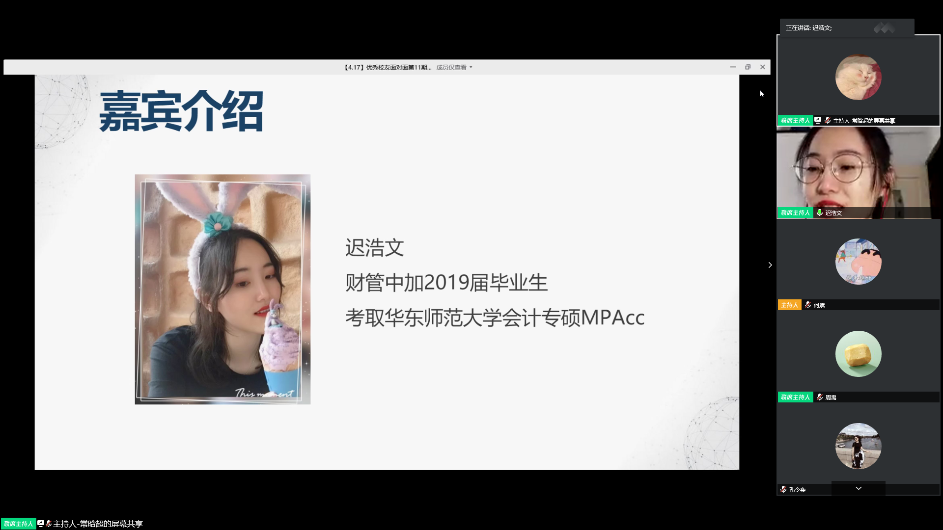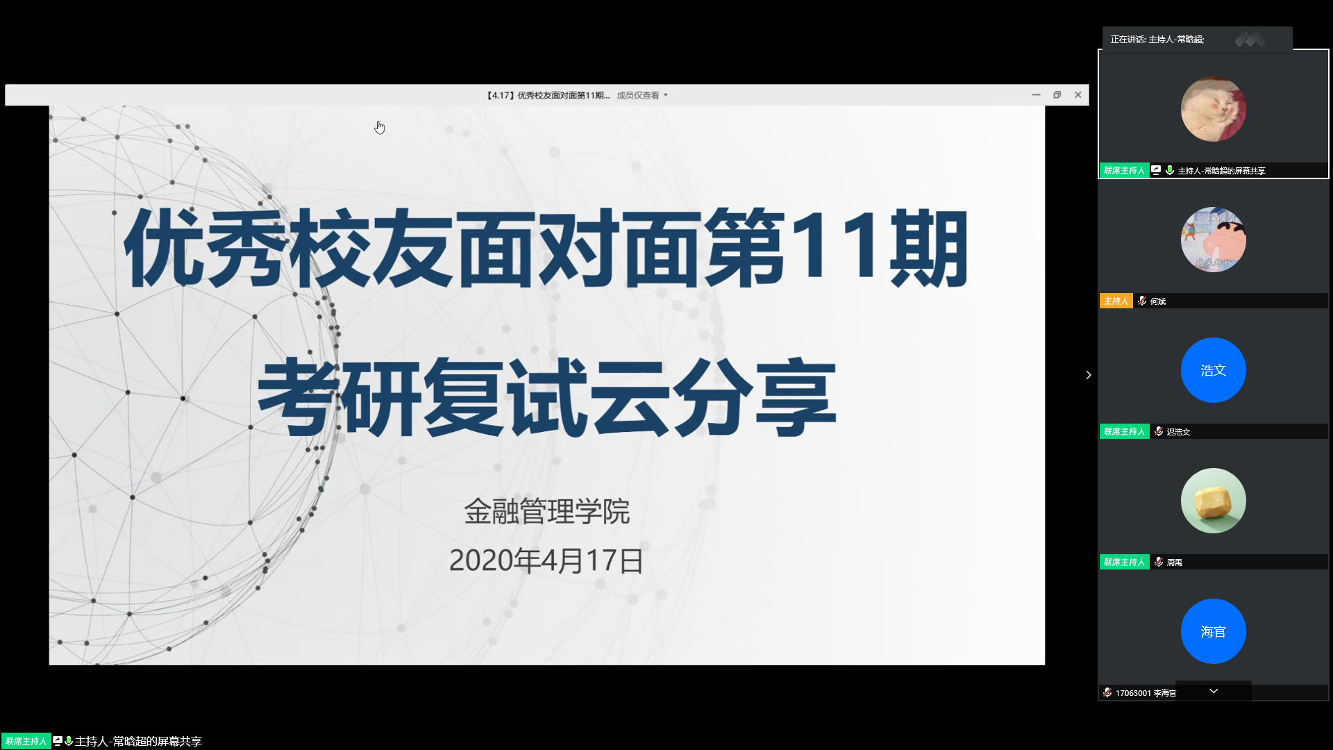 2020年4月17日14:00,上海對(duì)外經(jīng)貿(mào)大學(xué)金融管理學(xué)院“認(rèn)識(shí)一位校友,感悟一段成長(zhǎng)”優(yōu)秀校友面對(duì)面考研復(fù)試云分享依托騰訊會(huì)議平臺(tái),順利舉辦。2018屆校友、現(xiàn)就讀于上海財(cái)經(jīng)大學(xué)金融碩士(金融工程與量化投資方向)的周禹與2019屆校友、現(xiàn)就讀于華東師范大學(xué)會(huì)計(jì)專碩MPAcc的遲浩文受邀出席本次分享會(huì)。
