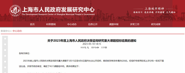 今日,上海市人民政府發展研究中心發布了《2023年度上海市人民政府決策咨詢研究重大課題招標結果》的通知,確定了45個課題組中標。我校共4項課題中標,其中我院2項課題中標。