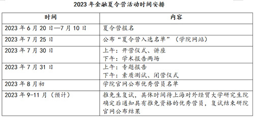 上海對外經貿大學金融管理學院將于2023年7月30日-31日舉辦“第二屆金融夏令營”活動,對于表現優秀的營員予以頒發優秀營員證書,對于取得推免生資格的優秀營員組織復試并給予2024年我校碩士研究生推免錄取機會。
