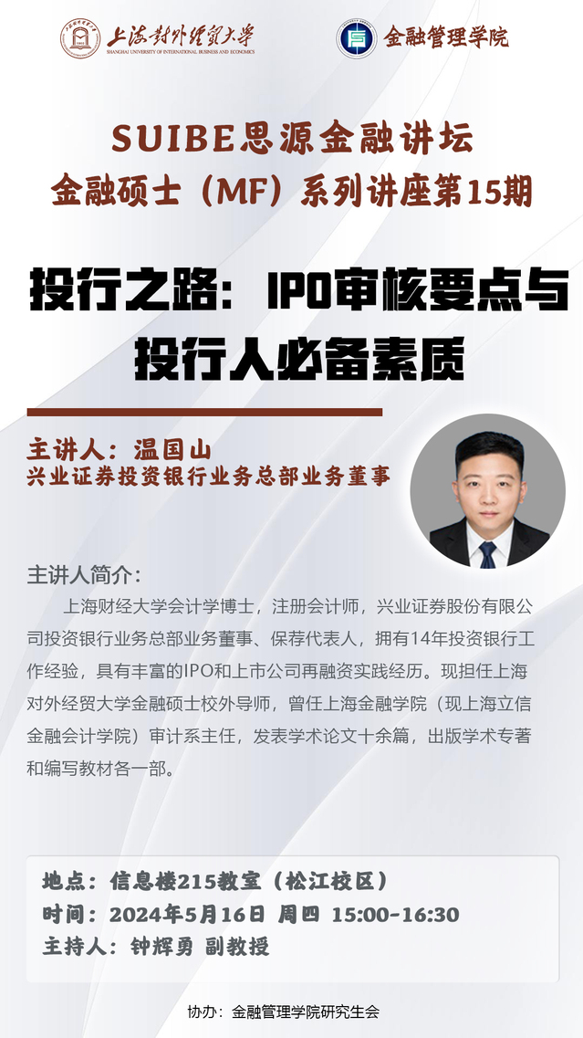 【SUIBE思源金融論壇——金融碩士(MF)系列講座第15期】投行之路:IPO審核要點與投行人必備素質