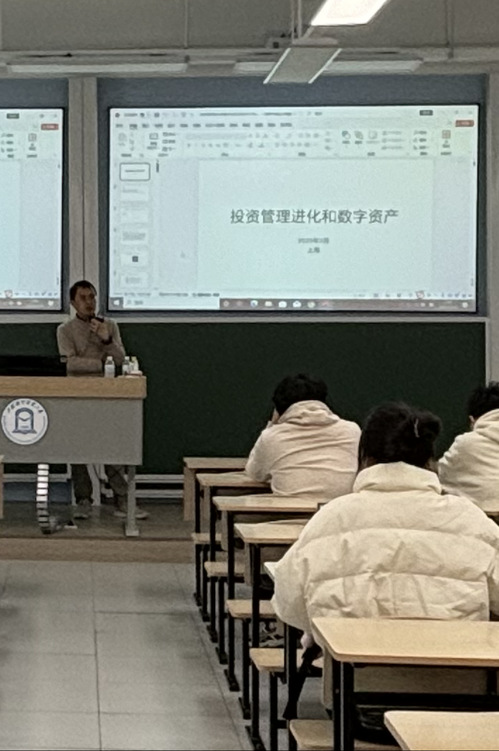 3月18日下午,數字金融產業學院行業師資進課堂系列活動第2期如期舉行,本次活動邀請了上海利位投資合伙人,原江海證券證券投資部總經理、國投瑞銀基金投資經理、華安基金高級研究員殷偉博士給本科生講授《投資管理進化和數字資產》。殷總首先分析了投資管理的進化 -- 不同階段理論的優劣勢及進化,然后分別從區塊鏈與數字資產對投資組合的貢獻以及金融投資研究的社交化與數字資產定價的維度探討了投資管理的進化,最后分享了他對金融職業生涯的進化的理解,包括一級和二級,投資和投行,科技、金融、企業三重周期下的選擇。整個講座干貨滿滿,受到了學生熱烈歡迎。