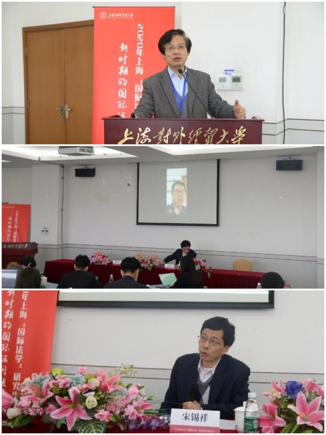 隨后,在上海對外經貿大學法學院宋錫祥教授的主持下,上海市法學會國際法研究會會長、復旦大學教授龔柏華以《服務更高水平開放的國際法研究和應用》為題發表了主旨演講。龔柏華教授聚焦國際貿易規則和國際投資規則的改革,期望同學們在新時代背景下加強國際法的研究與應用,以服務國家更高水平對外開放的需要。中國法學會世界貿易組織法研究會副會長、中國政法大學教授孔慶江,以線上方式發表了題為《WTO危機下國際社會的選擇》主旨演講。孔慶江教授介紹了WTO爭端解決機制的停擺過程,指出多方臨時上訴仲裁安排作用的有限性,并就WTO危機下中國的應對選擇提出了獨到的見解。