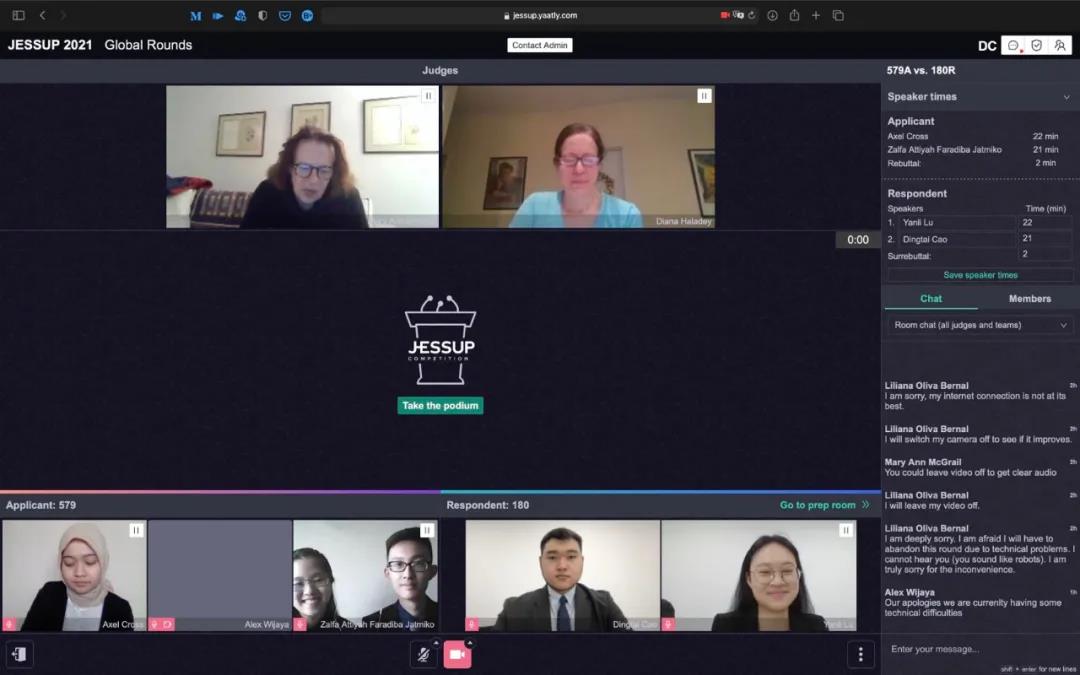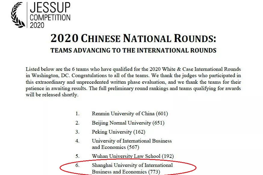 我校參與JESSUP國際模擬法庭比賽的歷史已有十余年,曾多次榮獲全國二等獎。2020年3月8日,Jessup(杰賽普)國際法模擬法庭競賽組委會公布了本年度中國內地賽區晉級第61屆Jessup全球總決賽的六強名單。上海對外經貿大學代表隊在56支參賽隊伍中以第六名的優異成績鎖定一等獎。在刷新我校參賽最佳戰績記錄的同時,實現了首次躋身全球總決賽的歷史性突破。據悉,我校代表隊為此次中國內地賽區華東地區唯一取得參賽資格的高校。(其他五支代表隊分別是中國人民大學、北京師范大學、北京大學、對外經濟貿易大學和武漢大學)。