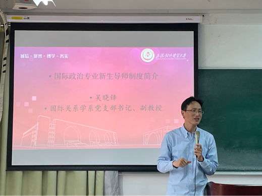 國際關系學系教工黨支部書記吳曉鋒老師首先介紹了國際政治專業新生導師制度的設計初衷。在安排一名專業教師擔任班主任之外,學系鼓勵所有專業教師擔任新生導師,旨在對新生的學習生活開展個性化、針對性的精準幫扶,積極引導大一學生更快更好地完成從高中生到大學生的角色轉變。