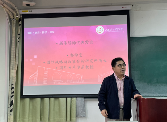 隨后,國際關系學系的郭學堂教授、詹德斌教授和樊冰博士作為新生導師代表先后發言。郭學堂教授以形象的“三子”比喻(腦瓜子、嘴皮子、筆桿子)寄語新生在大學四年里學好本領,增長才干。詹德斌教授告誡新生要平衡好學習與生活、專業與非專業、現在與未來的關系。樊冰博士則點出大學生鍛煉思維能力的重要性。