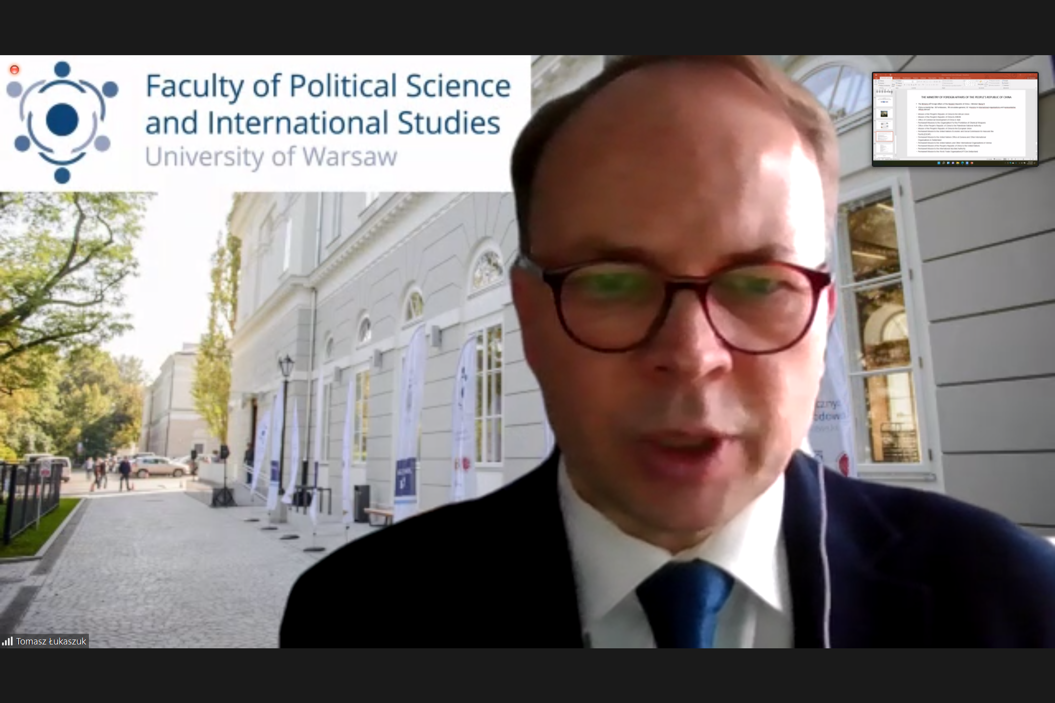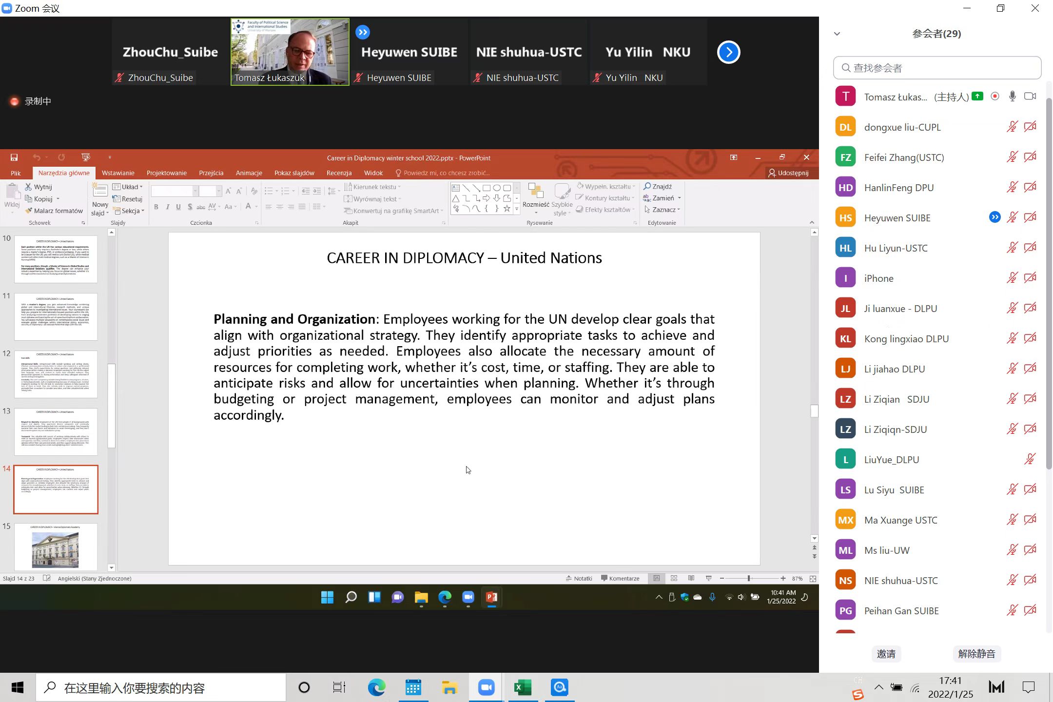 在課程設(shè)置上,波蘭華沙大學(xué)政治科學(xué)與研究學(xué)院根據(jù)自身所長(zhǎng)和學(xué)生所需,開設(shè)了有關(guān)歐盟歷史與架構(gòu)、金融、國(guó)際關(guān)系方面的課程。課程分別于2022年1月24-28日和2月7-11日分兩次對(duì)我校參加項(xiàng)目的同學(xué)開展,第一階段開設(shè)了華沙大學(xué)歷史名人與文化古鎮(zhèn)介紹、中歐經(jīng)濟(jì)關(guān)系、國(guó)際外交關(guān)系等課程;第二階段開設(shè)了國(guó)際金融市場(chǎng)、歐盟的歷史與架構(gòu)等課程。