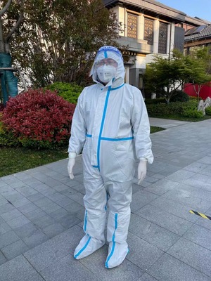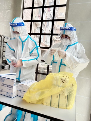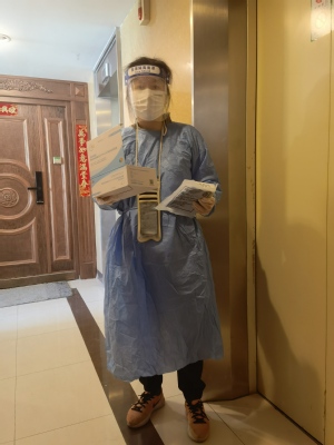 一早跟隨物資車穿梭在各個樓棟,清點防護服、分發(fā)手套口罩等物資。穿著防護服、帶著手套清點物資并不是容易,她客服困難,一絲不茍,確保物資發(fā)放到位。回家路上,她又主動幫助樓棟志愿者分發(fā)抗議試劑。