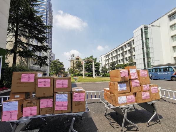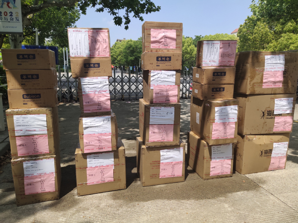 4月21日,繼法學院校友捐贈第一批防疫物資后,時隔24小時不到,又有43箱載著校友關愛的愛心防疫物資,分送至我校松江校區和古北校區。
