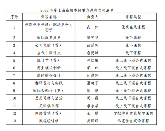 近日,上海市教委發布了《上海市教育委員會關于公布2022年度上海高校市級重點課程立項名單的通知》(滬教委高〔2022〕27號),我校申報的《創新創業創造:職場競爭力密鑰》等13門課程全部獲得立項。其中,優質在線課程1門,線下課程3門,線上線下混合式課程7門,虛擬仿真實驗教學課程1門,示范性全英語課程1門。