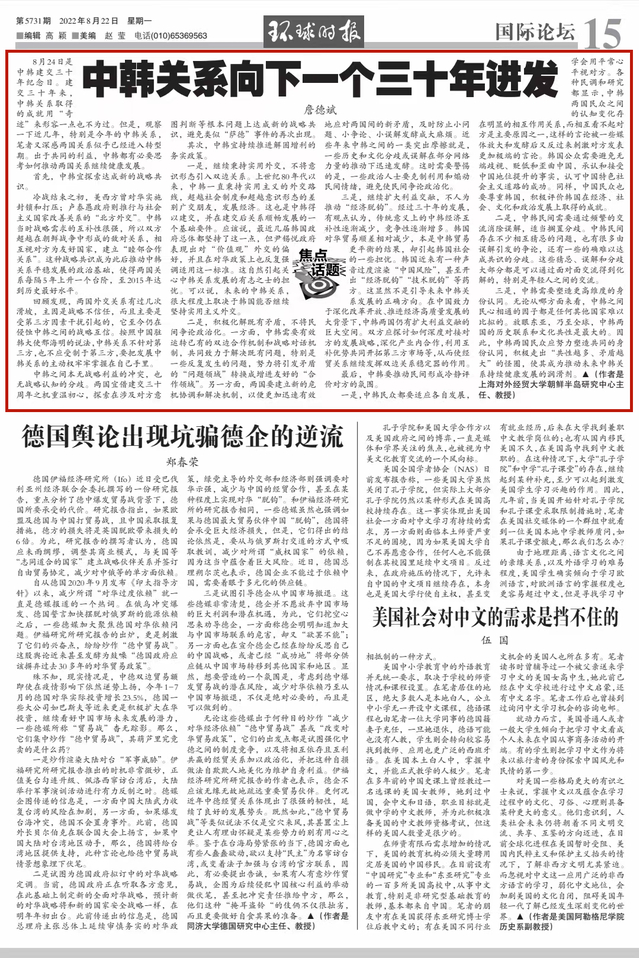 8月22日,法學院詹德斌教授在《環球時報》刊發題為《中韓關系向下一個三十年進發》的署名時評文章,以紀念8月24日中韓建交三十周年,文章闡述了中韓關系進入轉型期,推動兩國關系繼續健康發展的三點思考。詹德斌認為:中韓兩國宜探索達成新的戰略共識,在兩國建交三十周年之際重溫初心,把發展兩國關系的主動權牢牢把握在兩國手中。中韓兩國宜持續推進解困增利的務實政策,繼續秉持實用外交,不將意識形態引入雙邊關系;積極化解既有矛盾,不將民間爭論政治化;繼續擴大利益交融,不人為推動“經濟脫鉤”。中韓兩國民間宜進一步增進交流,加強相互尊重,共同面向未來推動中韓關系持續健康發展。