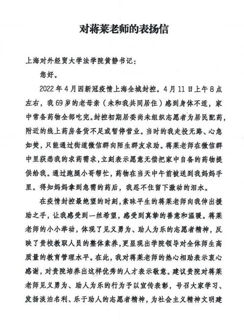 信中表示,在4月上海疫情封控初期,該居民獨居的高齡母親家中常備藥用盡,社區(qū)尚未組織居民配藥服務,心急如焚的她只能通過街道微信群向陌生群友求助。蔣萊老師第一時間伸出援手,無償提供家中自備藥,為素昧平生的居民解決燃眉之急。