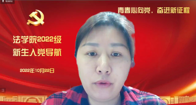為進一步貫徹落實黨的二十大精神,加強新生的思想引領,用黨的科學理論武裝青年,用黨的初心使命感召青年,10月22日上午,法學院在線舉行“青春心向黨,奮進新征程”2022級新生入黨導航。校關工委法學院分會副主任張菊英、學院黨委副書記商志民、黨委組織員馮予婧、學生黨員代表霍俊先、各學生黨支部書記以及全體新生參加活動。活動由馮予婧主持。