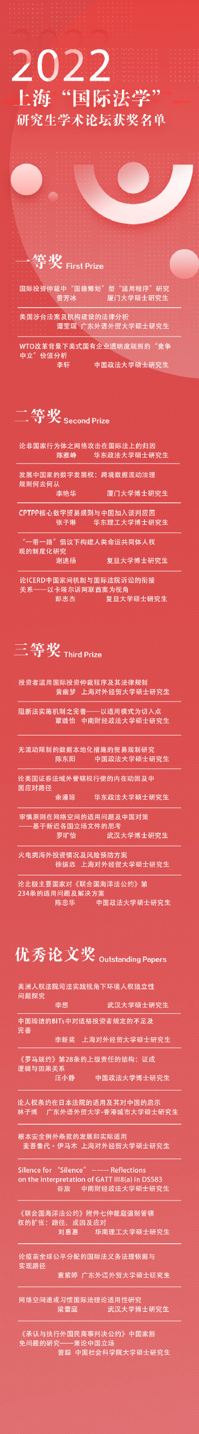 本次論壇以“大變局下的國際法治”為主題,收到了來自包括復旦大學、武漢大學、廈門大學、中國政法大學、中南財經政法大學、華東理工大學、華南理工大學、華東政法大學、中國社會科學院大學、香港城市大學等近40所境內外高校的碩博研究生投稿近150篇。論壇最終評選出獲獎論文25篇,其中一等獎3篇,二等獎5篇,三等獎7篇,優秀獎10篇。