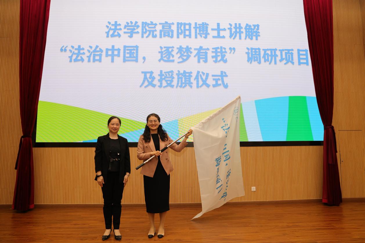 為扎實(shí)推進(jìn)主題教育,深入學(xué)習(xí)習(xí)近平法治思想,引導(dǎo)師生深刻把握黨領(lǐng)導(dǎo)法治建設(shè)的百年輝煌歷程和歷史經(jīng)驗(yàn),深入生動的法治實(shí)踐一線開展調(diào)查研究,本屆法律文化節(jié)還分別啟動了“黨史中的法治小故事”微黨課項(xiàng)目和“法治中國,逐夢有我”調(diào)研項(xiàng)目。黃靜、高陽依次對項(xiàng)目實(shí)施情況和下一步工作計劃做了介紹。郭茜為調(diào)研項(xiàng)目授旗。
