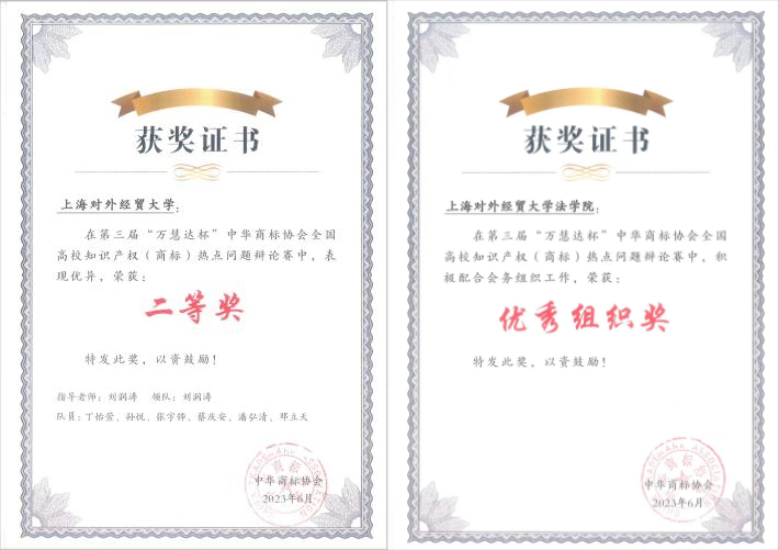近日,第三屆“萬慧達杯”中華商標協(xié)會全國高校知識產(chǎn)權(商標)熱點問題辯論賽在2023中國國際商標品牌節(jié)落下帷幕。來自北京大學、清華大學、中國人民大學、中國政法大學、同濟大學、華東政法大學、上海大學、上海對外經(jīng)貿(mào)大學等全國范圍內(nèi)三十多所高校參加本屆辯論賽。歷經(jīng)多輪激烈角逐,我校代表隊榮獲全國二等獎,我校法學院獲“優(yōu)秀組織獎”。