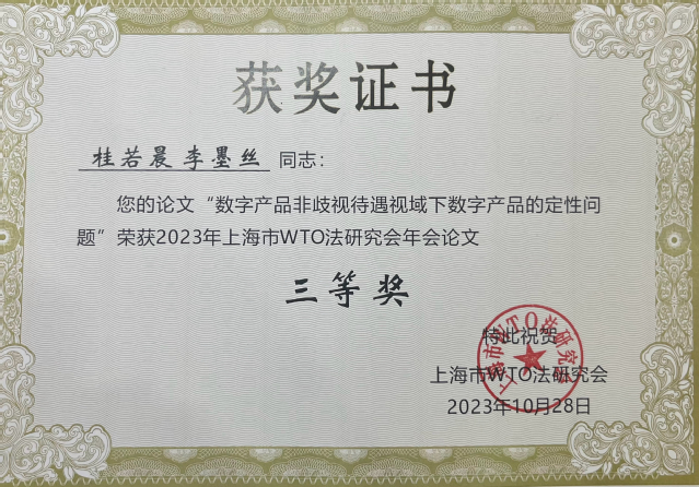 我院2022級國際法學(xué)專業(yè)研究生桂若晨與導(dǎo)師李墨絲研究員的合作論文《數(shù)字產(chǎn)品非歧視性待遇視域下數(shù)字產(chǎn)品的定性問題》獲2023年上海市WTO法研究年會論文三等獎。陶立峰教授、藺捷教授、李樺佩副教授以及2022級國際法學(xué)研究生桂若晨、房天運、王梓懿、周舟,2021級涉外卓越法律人才實驗班趙斯雨等同學(xué)做了會議發(fā)言。