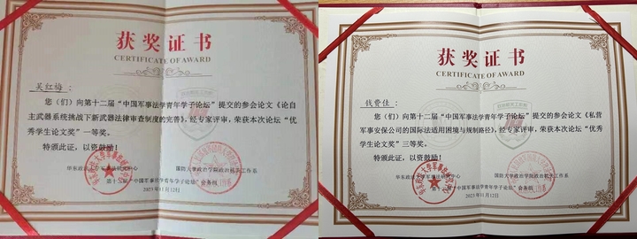 2021級國際法學專業研究生吳紅梅同學(導師:陶立峰)撰寫論文《論自主武器系統挑戰下新武器法律審查制度的完善》、2023級法律碩士(法學)研究生錢費佳同學(導師:吳寧鉑)撰寫論文《私營軍事安保公司的國際法適用困境與規制路徑》,在第十二屆“中國軍事法學青年學子論壇”上分別榮獲“優秀學生論文獎”一等獎和三等獎。
