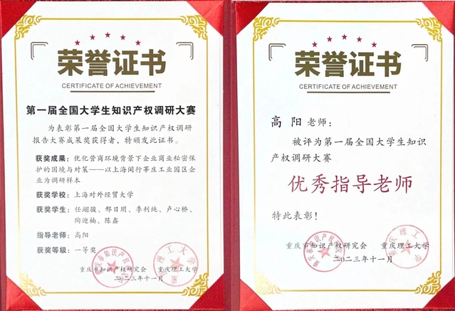 11月25日,首屆全國大學生知識產權調研大賽在重慶理工大學落下帷幕。我校代表隊歷經初賽、復賽、決賽多輪激烈競爭,最終脫穎而出,榮獲全國一等獎,法學院高陽老師榮獲“優秀指導老師”稱號。
