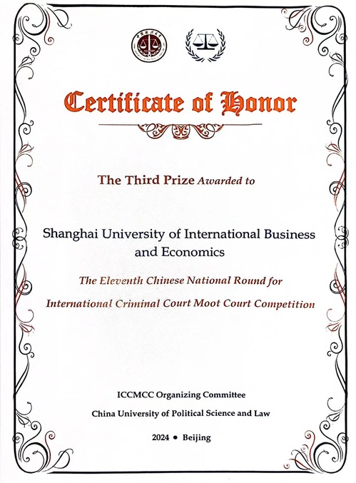 2024年3月23日至24日,第十一屆國際刑事法院模擬法庭競賽(英文)中國賽區(qū)選拔賽在北京舉行。67所中國內(nèi)地高校報名參賽,規(guī)模為歷屆之最。上海對外經(jīng)貿(mào)大學(xué)代表隊表現(xiàn)出色,與北京大學(xué)、復(fù)旦大學(xué)、對外經(jīng)濟貿(mào)易大學(xué)等27所院校共同晉級最終決賽階段,榮獲全國三等獎。