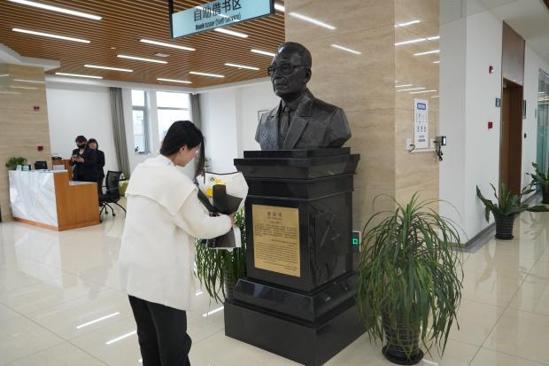 在圖書館一樓大廳裘老塑像前,師生開展了祭奠活動。面向裘老塑像,大家列隊整齊,肅穆靜立,學生代表上前輕輕擦拭裘老塑像,敬獻鮮花,師生集體默哀,深深鞠躬,向裘老致以崇高的敬意和無限哀思。