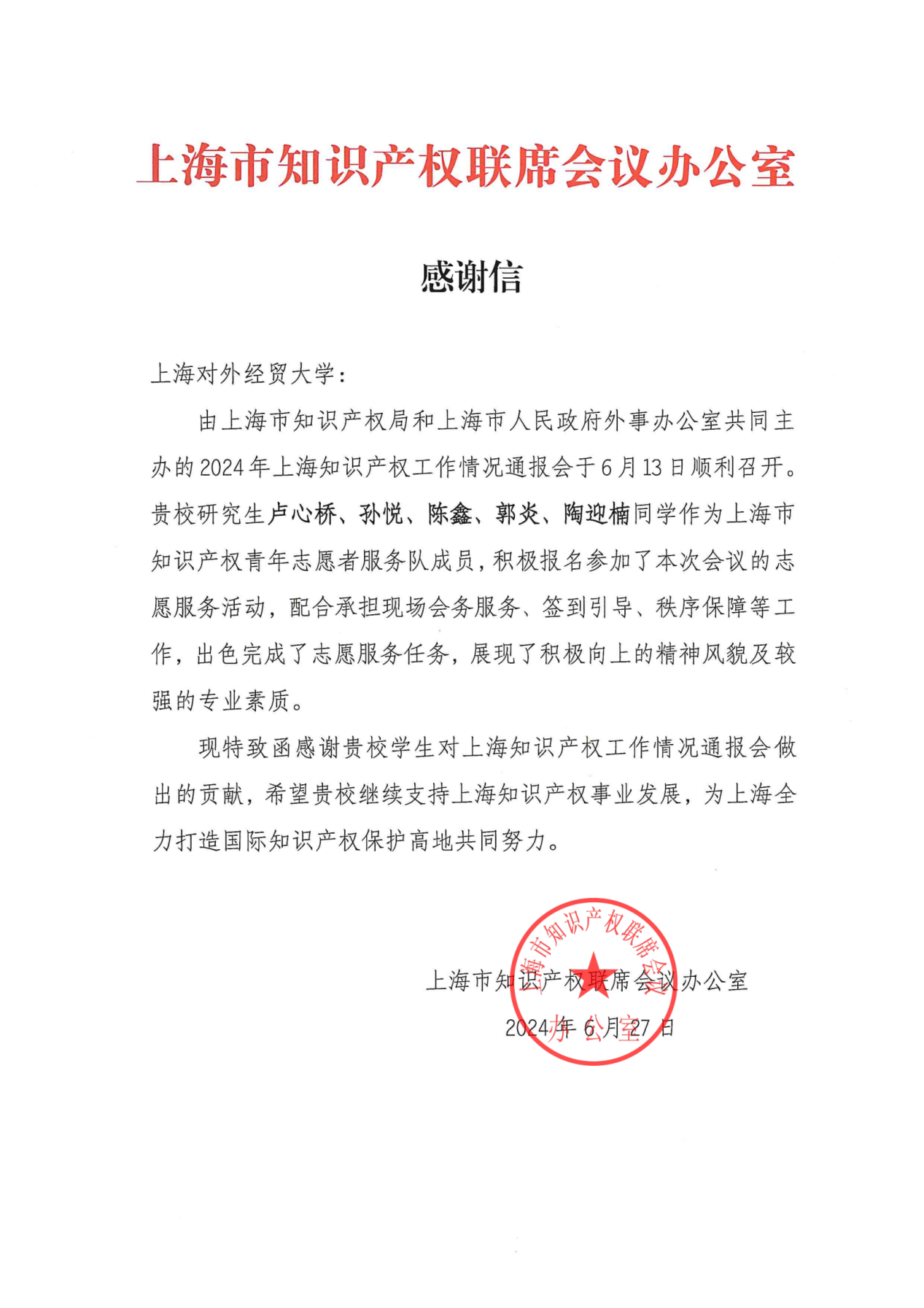 近日,我校法學院收到來自上海市知識產權聯席會議辦公室的感謝信,信中表達了對法學院5名知識產權專業研究生盧心橋、孫悅、陳鑫、郭炎、陶迎楠擔任志愿者,對上海知識產權工作情況通報會做出的貢獻表示感謝。這是繼去年該辦公室致信感謝我校研究生志愿者后,再次發來的感謝信。