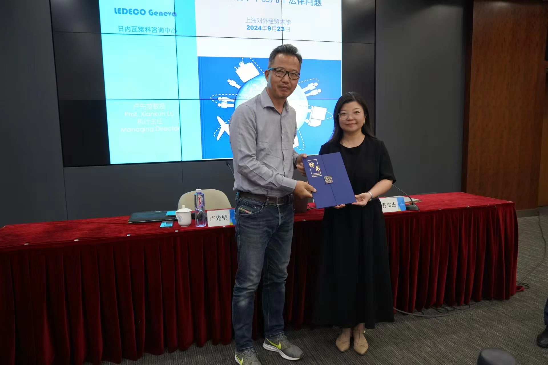 講座開始前,舉行了簡短的聘任儀式。法學院黨委書記喬檀向盧先堃教授頒發“上海對外經貿大學涉外法治教育專家顧問”聘書。