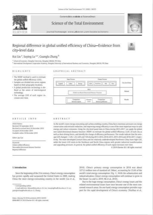 Kui Liu,Suying Lu&Guanglu Zhang,“Regional difference in global unified efficiency of China—Evidence from city-level data”, Science of the Total Environment,2020(713)