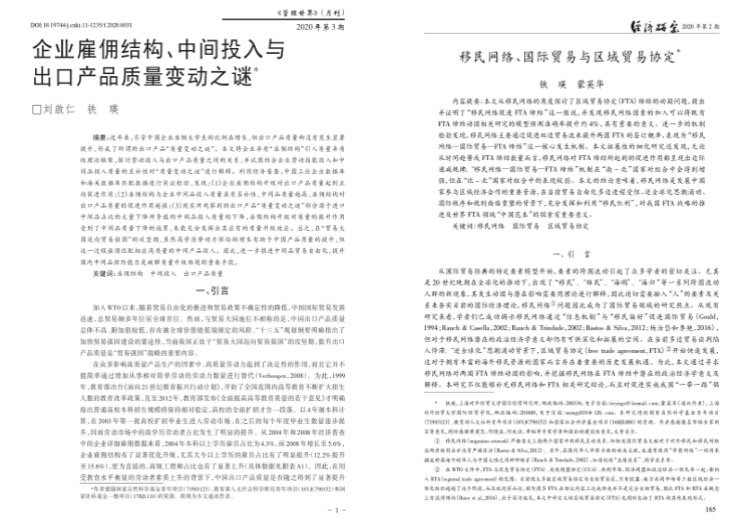 劉啟仁、鐵瑛(通訊作者),“企業雇傭結構、中間投入與出口產品質量變動之謎”,管理世界,2020年第3期