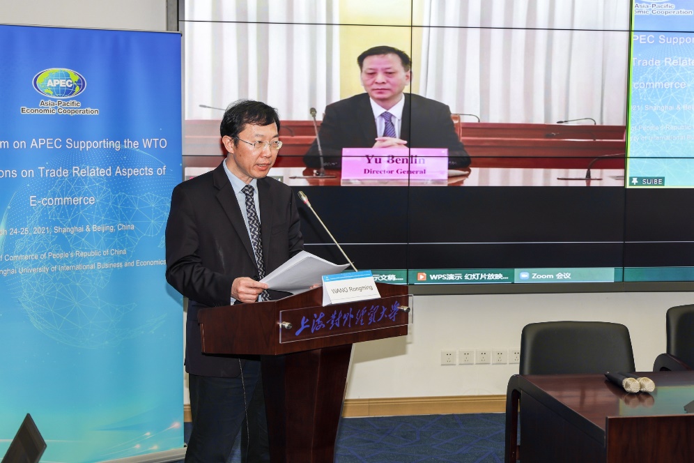 汪榮明對參會代表表示熱烈歡迎。他在致辭中指出,學校自建校以來,始終與中國的對外開放,特別是對外貿易和經濟合作的發展息息相關。2020年,學校與上海市商務委員會合作成立了數字貿易研究院,共同深化數字貿易領域的研究。本次研討會的召開將有助于APEC各經濟體充分交流信息、交換意見、增進理解、彌合分歧,為APEC推動WTO電子商務談判取得成果、支持多邊貿易體制做出積極貢獻,為深化電子商務和數字貿易領域的研究貢獻智慧和力量。